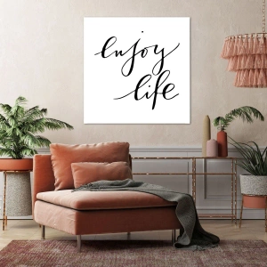 - Uma impressão em tela moderna com a frase "aproveite a vida" em caligrafia elegante sobre fundo branco. Perfeita para interiores minimalistas e modernos, ela adiciona um toque inspirador.