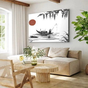 Quadro em tela - Paisagem oriental com um pescador em um barco e um sol vermelho - 70x50cm - Tarde asiática - Decoração de parede moderna para a sala de estar e quarto ARTTOR