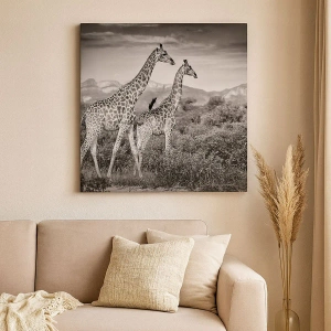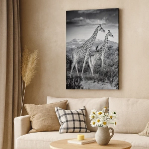 - Esta elegante pintura em preto e branco retrata duas girafas na savana africana. Esta composição minimalista, com animais selvagens, é perfeita para interiores modernos.