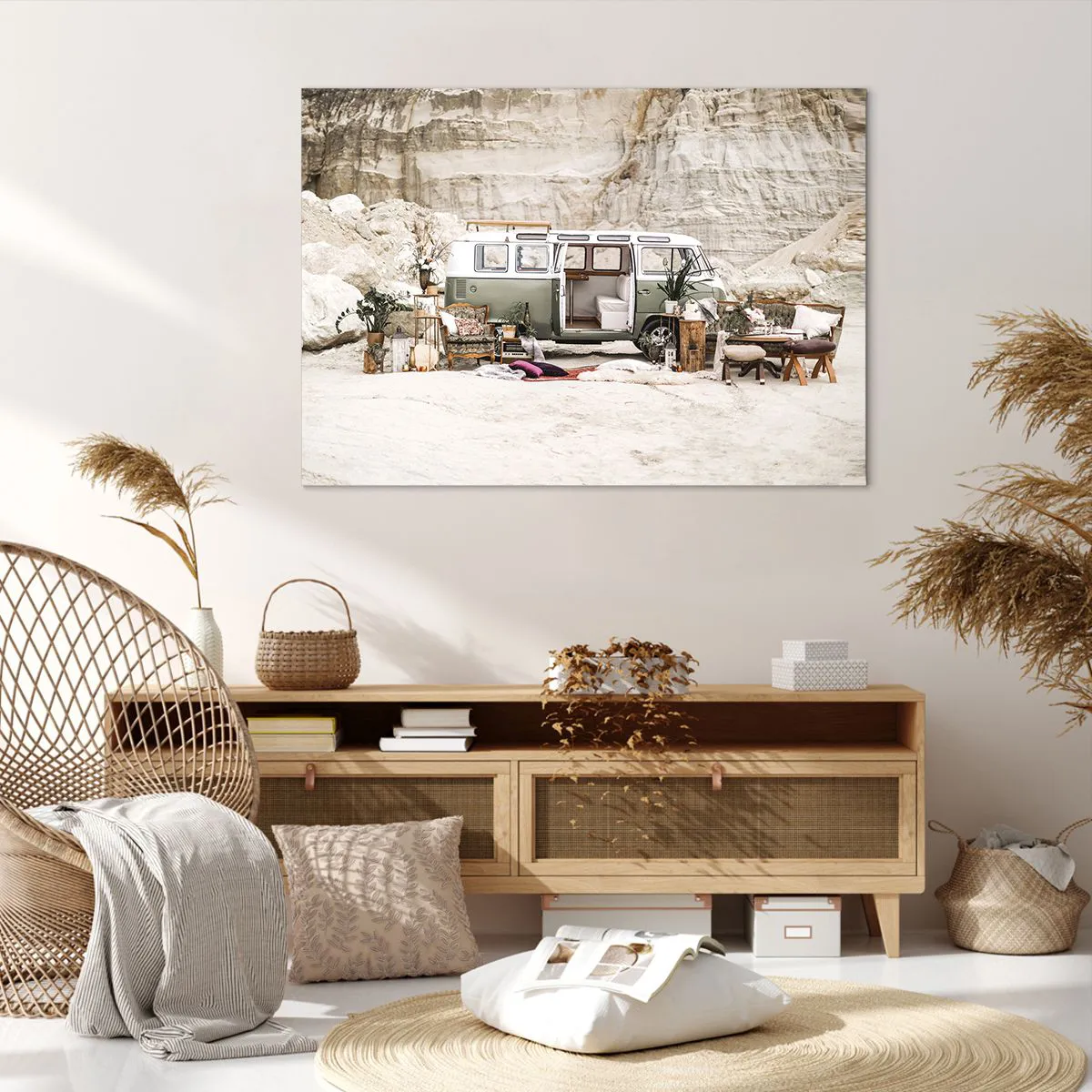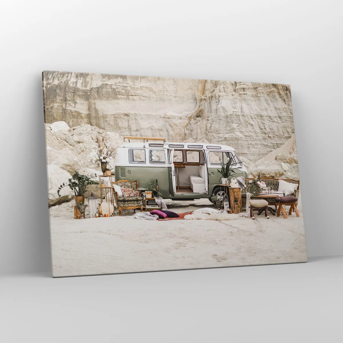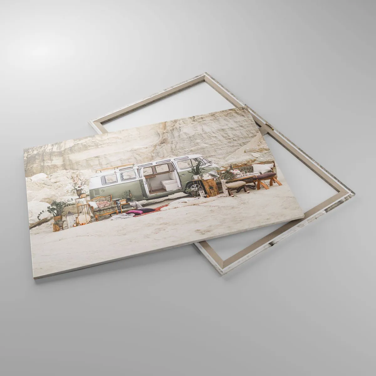 A tela é esticada na moldura. Os lados e bordas são impressos para criar uma continuação da imagem. O quadro está pronto para ser pendurado na parede. Cada produto tem um gancho ligado à moldura e um conjunto de montagem (parafuso + cavilha).