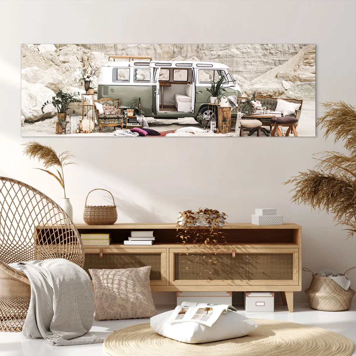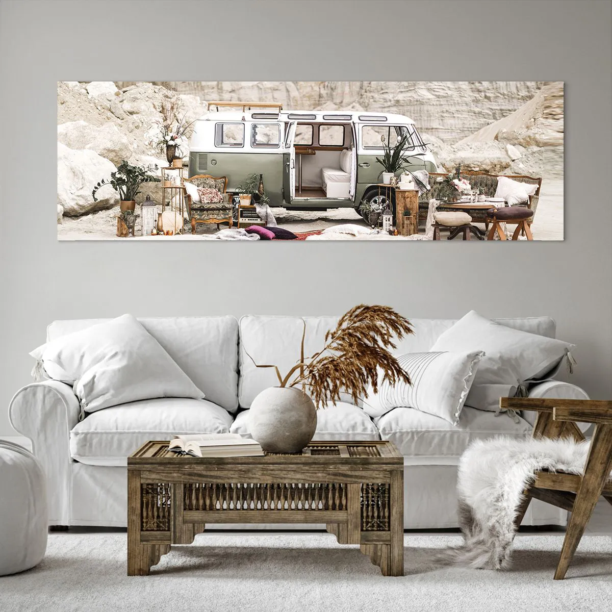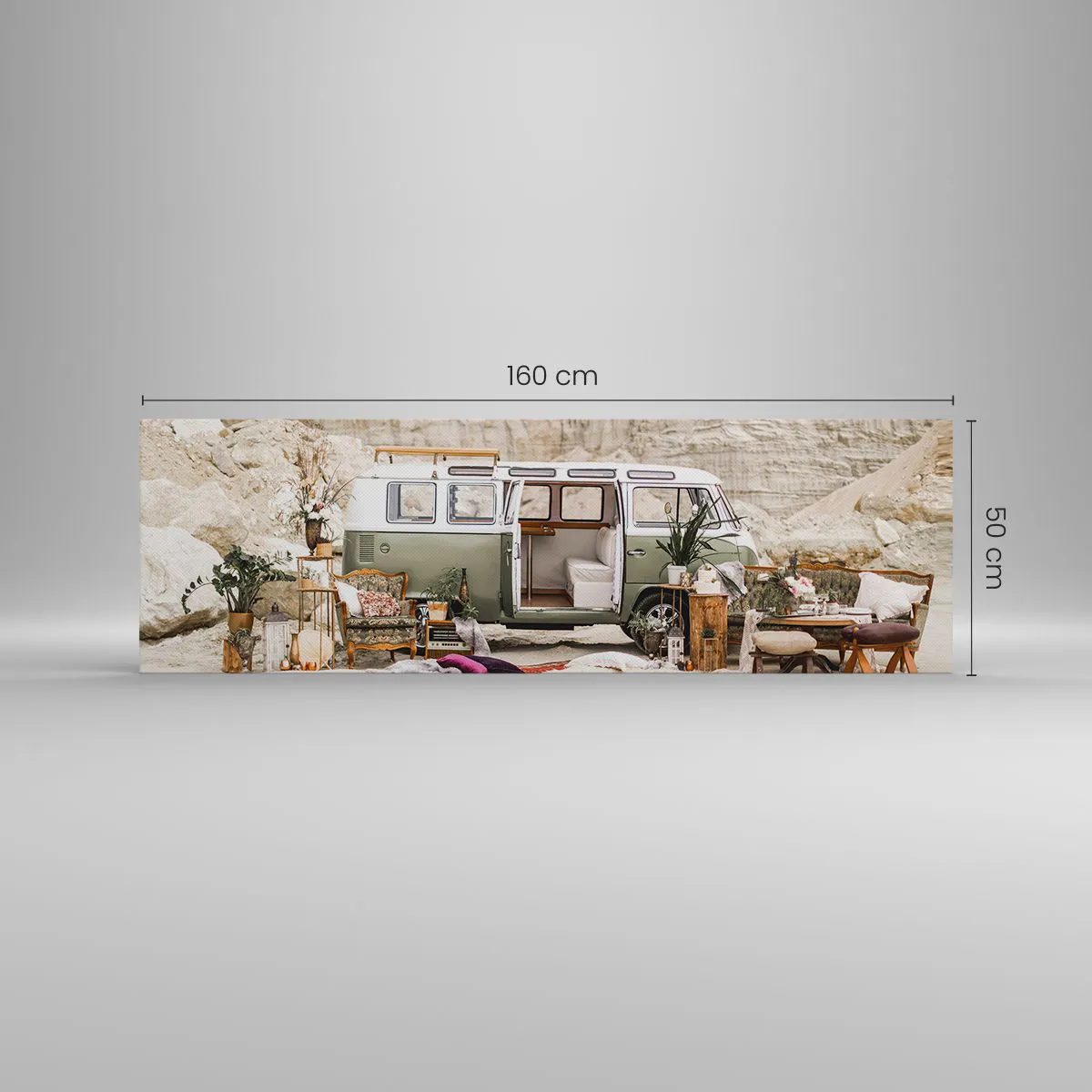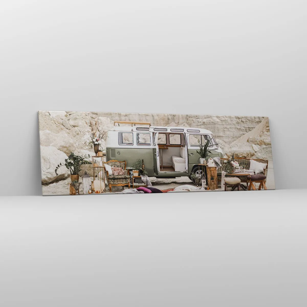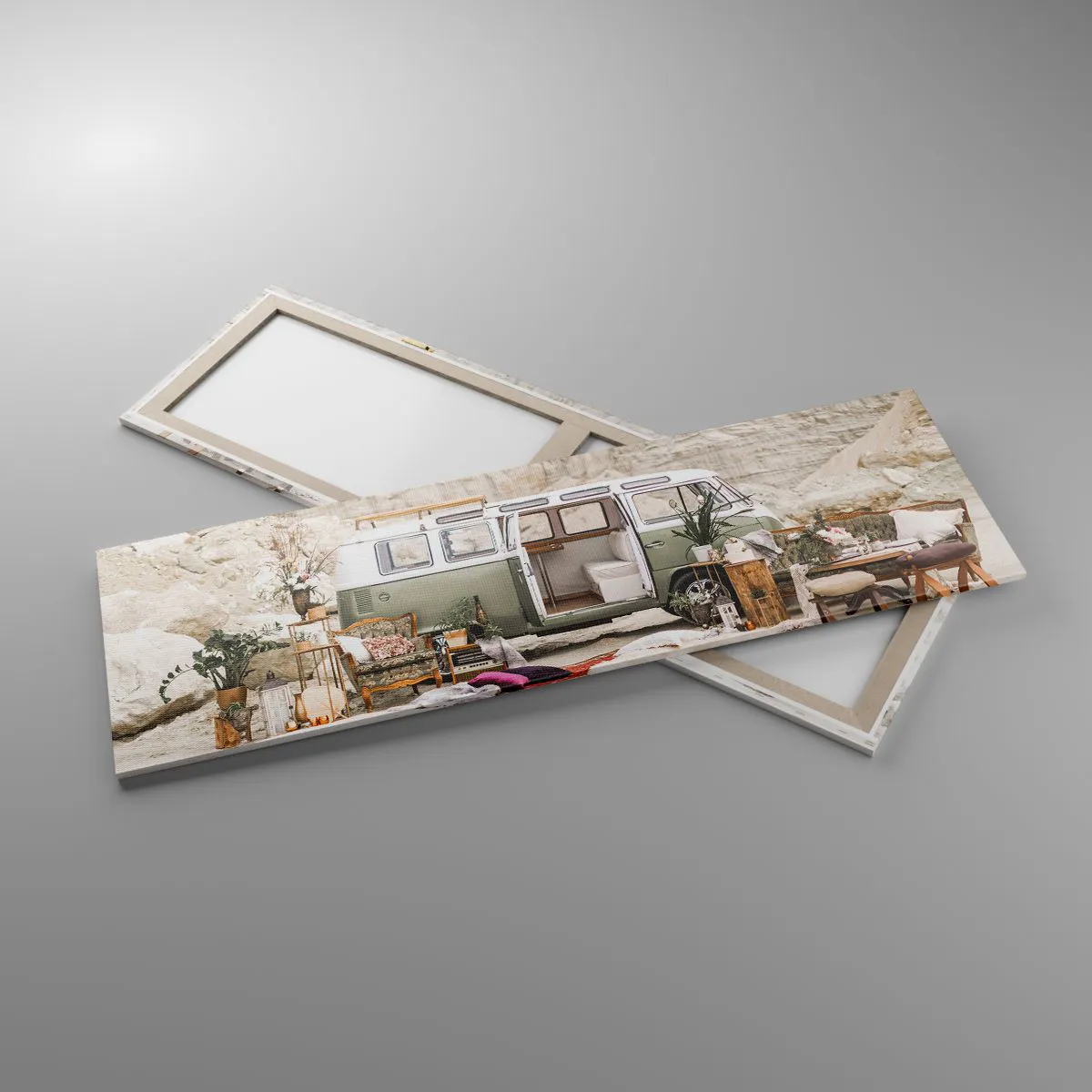 A tela é esticada na moldura. Os lados e bordas são impressos para criar uma continuação da imagem. O quadro está pronto para ser pendurado na parede. Cada produto tem um gancho ligado à moldura e um conjunto de montagem (parafuso + cavilha).