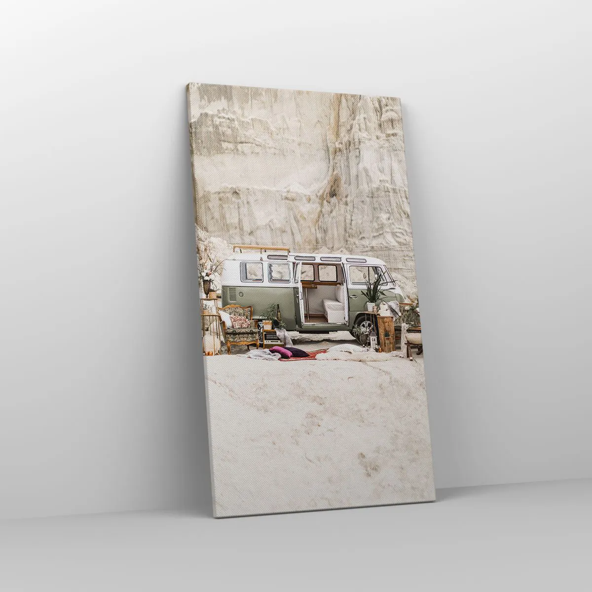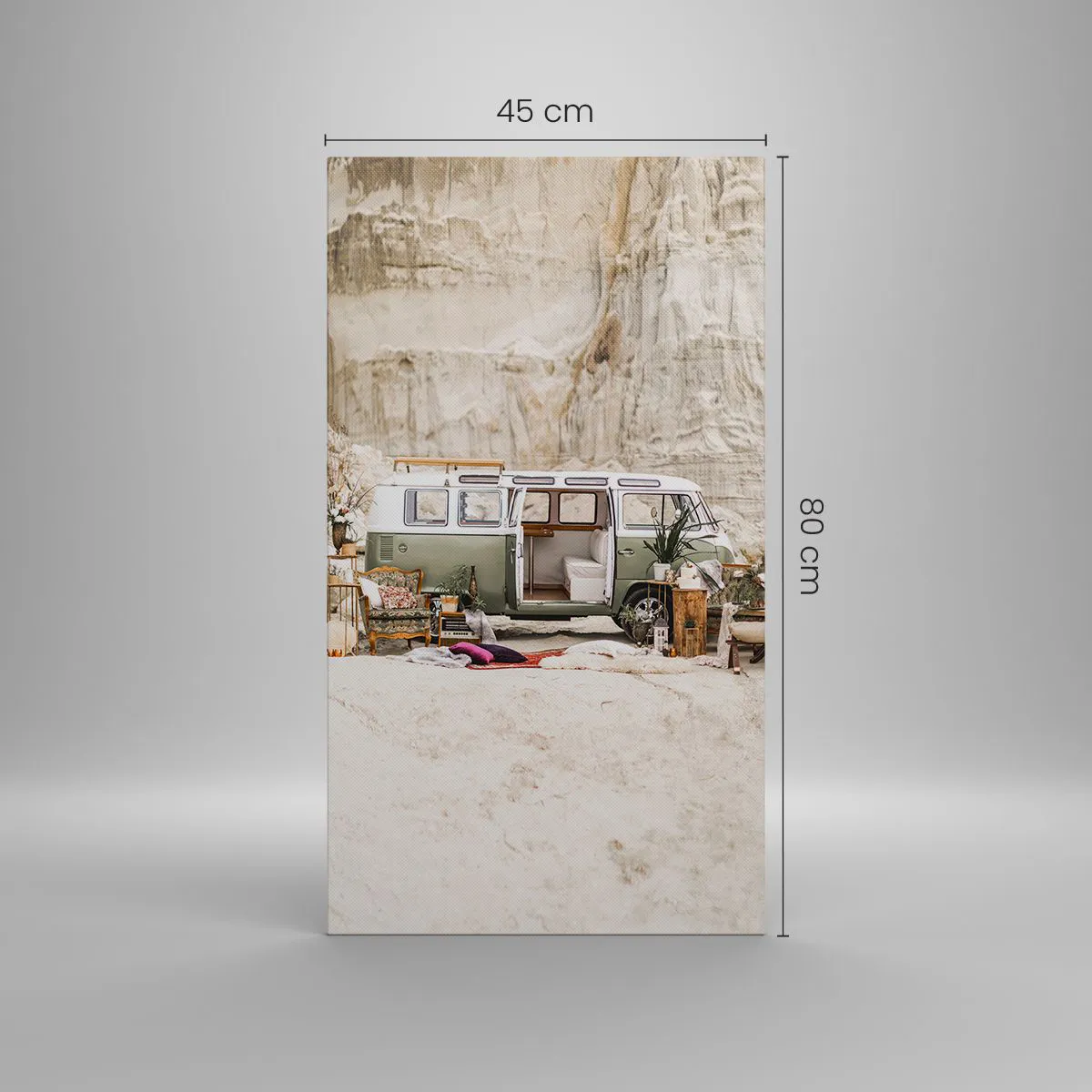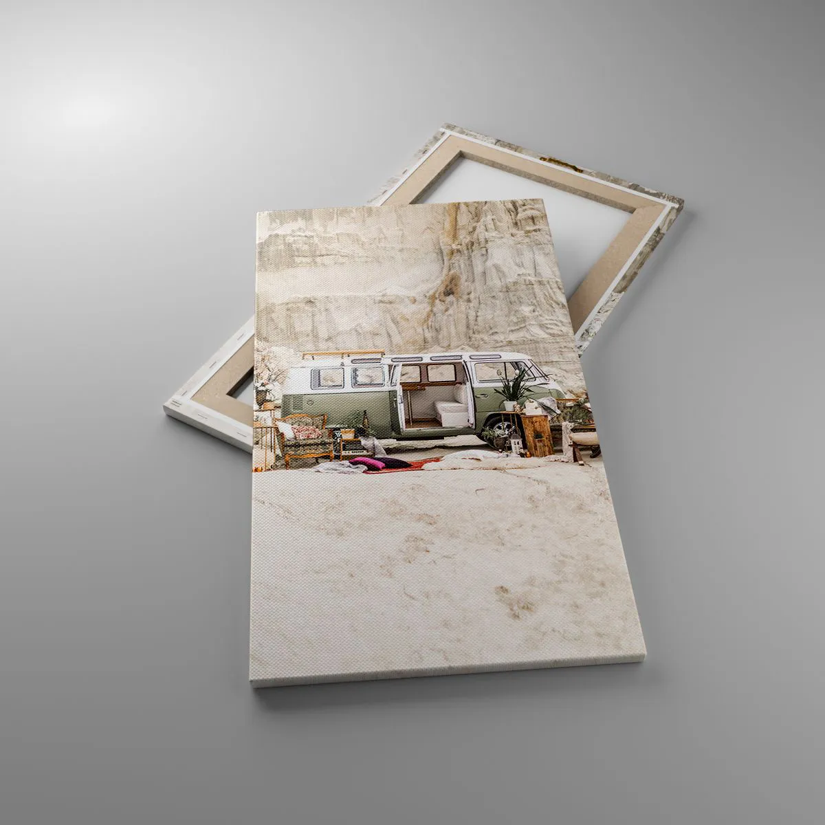 A tela é esticada na moldura. Os lados e bordas são impressos para criar uma continuação da imagem. O quadro está pronto para ser pendurado na parede. Cada produto tem um gancho ligado à moldura e um conjunto de montagem (parafuso + cavilha).