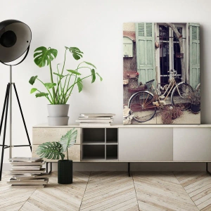 Quadro em tela - Bicicletas vintage em frente a uma porta de madeira com persianas em tons pastéis - 70x50cm - Viva a província - Decoração de parede moderna para a sala de estar e quarto ARTTOR