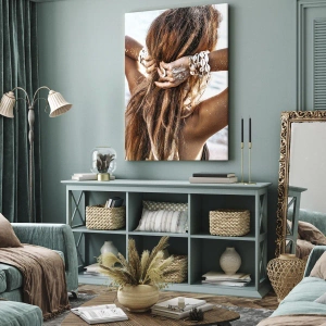 - A pintura retrata uma mulher na praia em um dia ensolarado de verão. Seus cabelos soltos, adornados com pulseiras de conchas, adicionam um toque boho. As cores naturais e a atmosfera de verão tornam esta pintura perfeita para interiores bem iluminados.