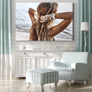 Arte de Parede - Irmã da Água e do Sol - Mulher na Praia com Cabelos ao Vento ao Sol