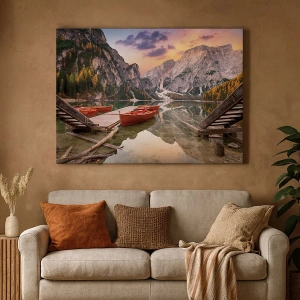 A impressão em tela "Promessa do Dia" é uma visão única da natureza, cativante por sua harmonia e tranquilidade. Ela retrata um pitoresco lago na montanha cercado por picos majestosos, com barcos de madeira em primeiro plano. As cores quentes do pôr do sol e os reflexos na água criam uma atmosfera de relaxamento e inspiração.
