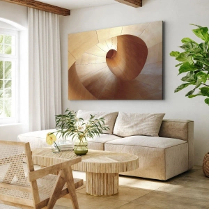 - Esta impressão em tela de 70x50 cm retrata uma espiral abstrata em tons de madeira e marrom claro. Uma escolha perfeita para os amantes do design moderno e da simplicidade elegante.