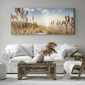 Quadro em tela - Uma praia pitoresca com grama e o pôr do sol - 70x50cm - Praia do Norte - Decoração de parede moderna para a sala de estar e quarto ARTTOR