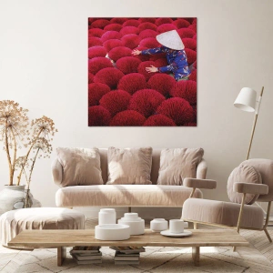• Esta tela de 70x50 cm retrata uma mulher com um chapéu tradicional em meio a incensos vermelhos. Uma decoração marcante, perfeita para interiores modernos e exóticos.