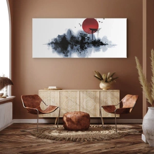 - Esta impressão em tela de 70x50 cm retrata um sol vermelho sobre uma paisagem pitoresca com torii. Uma decoração perfeita para um ambiente minimalista em estilo japonês.