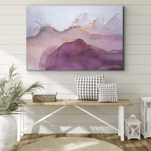 - Esta impressão em tela de 70x50 cm retrata uma composição abstrata em tons de roxo com detalhes dourados. Uma decoração elegante para interiores modernos.