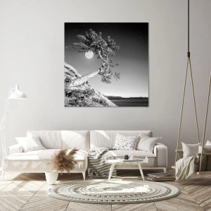 A pintura Árvore sob a Lua é uma composição única em preto e branco que retrata uma árvore solitária em um penhasco ao luar. Os detalhes da árvore, a textura do penhasco e as sutis transições tonais enfatizam a harmonia e a beleza da natureza. Toda a peça é mantida em um estilo minimalista que se encaixa perfeitamente em interiores modernos.