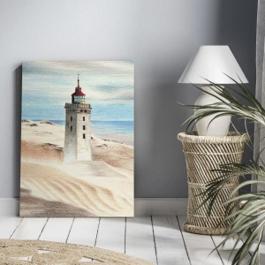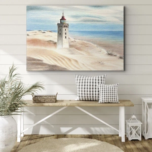 • Esta pintura retrata um farol tendo como pano de fundo dunas de areia e um céu azul. Perfeita para interiores inspirados na natureza e na tranquilidade. A impressão é em tela e mede 70x50 cm.