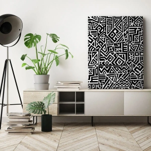 A impressão em tela "Composição Pré-Colombiana" é uma decoração única que combina padrões geométricos com inspiração na cultura pré-colombiana. A paleta de cores em preto e branco, repleta de contrastes e simetria, confere à composição um caráter moderno, ao mesmo tempo que faz referência à rica história e tradição.