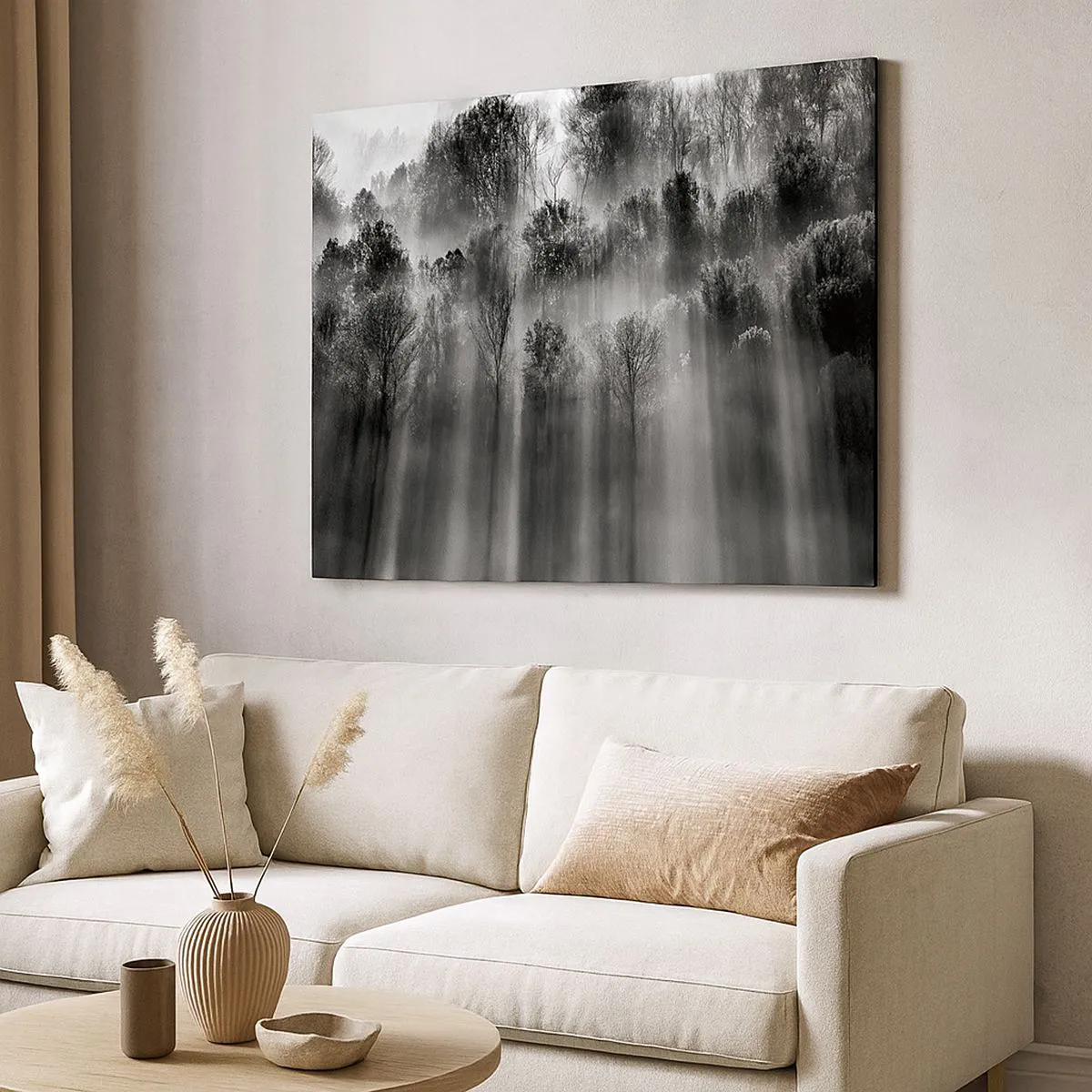 - Uma fotografia em preto e branco de uma floresta iluminada pelos raios de luz da manhã. A imagem traz harmonia, elegância e tranquilidade ao interior.