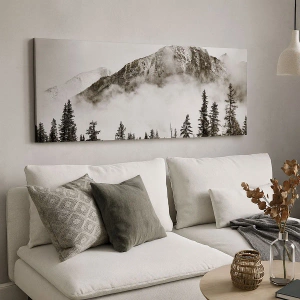 Quadro em tela - Um pico de montanha pitoresco cercado por neblina e uma floresta em tons de sépia - 70x50cm - O soberano de granito - Decoração de parede moderna para a sala de estar e quarto ARTTOR