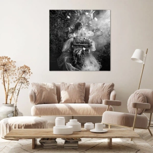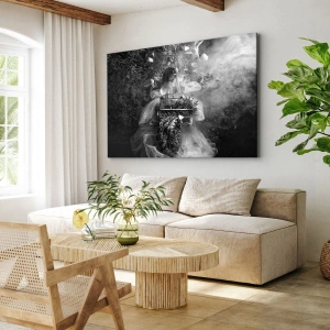 Quadro em tela - Uma composição em preto e branco com uma figura de vestido e uma gaiola na neblina. - 70x50cm - A própria mãe – natureza - Decoração de parede moderna para a sala de estar e quarto ARTTOR