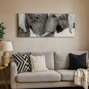 - Dois elefantes em um gesto terno, apresentados em tons monocromáticos. Uma pintura única que traz harmonia e elegância a qualquer interior.