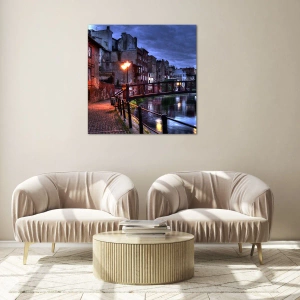 - Uma charmosa rua com canal, uma ponte e iluminação noturna envolvente. Esta impressão em vidro de 70x50 cm é perfeita para interiores nostálgicos e românticos.