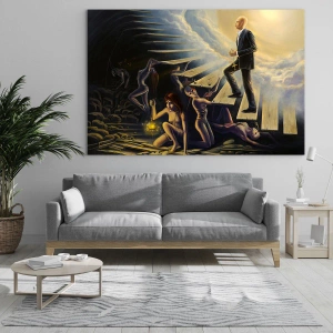 - Uma escada simbólica que leva à luz, com figuras surreais sobre um fundo escuro. Esta pintura em vidro de 70x50 cm é perfeita para interiores com um toque de mistério e profundidade filosófica.