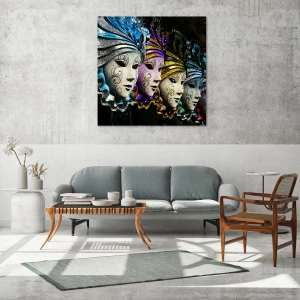 - pintura retrata máscaras venezianas coloridas dispostas em fileira, repletas de brilho e detalhes. Este motivo inspirado no carnaval é perfeito como elemento decorativo, introduzindo uma atmosfera teatral a qualquer interior.