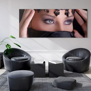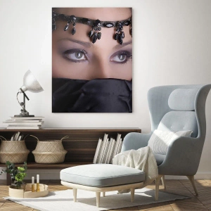 Quadro em vidro - Um rosto de mulher com uma tiara ornamentada e um olhar intenso - 70x50cm - Mistério tentador do oriente - Decoração de parede moderna para a sala de estar e quarto ARTTOR