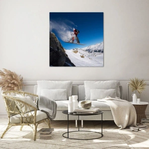 O tema da pintura inspira ação e o prazer da atividade física. Um snowboarder pulando é um símbolo de liberdade, coragem e paixão que energizará qualquer ambiente. Graças às suas cores vibrantes e ao contraste entre a neve e o céu, a pintura traz frescor e expressão ao interior.