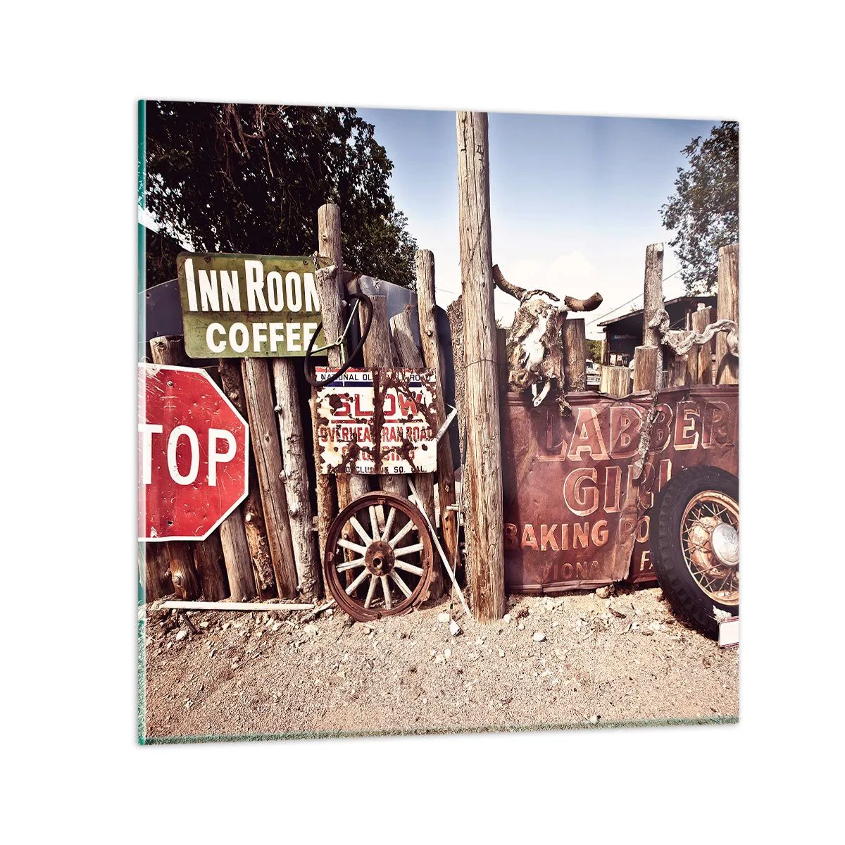 O quadro em vidro é feito de vidro de 4mm de espessura. As bordas do vidro têm um corte trapezoidal fosco. O quadro é segura de usar e pronto para pendurar – tem ganchos de metal presos à parte de trás do quadro e e espaçadores de espuma para regular a distância uniforme do quadro da parede.