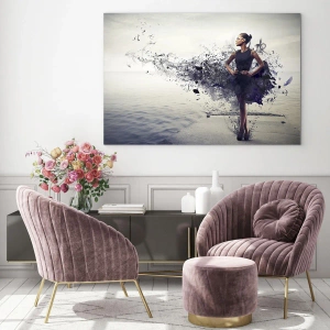 A impressão artística em vidro "Mulher em um vestido desfocado contra um fundo de águas calmas" é uma decoração única que combina arte moderna e beleza sutil. O motivo central é a figura de uma mulher em um vestido artístico, cuja forma desfocada adiciona um caráter único ao conjunto. O fundo retrata uma superfície calma de água, que traz harmonia e paz à composição.