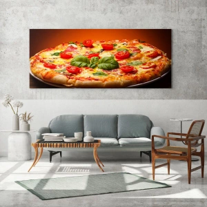 Quadro em vidro - Pizza com tomate, manjericão e queijo derretido - 70x50cm - Mamma mia! - Decoração de parede moderna para a sala de estar e quarto ARTTOR