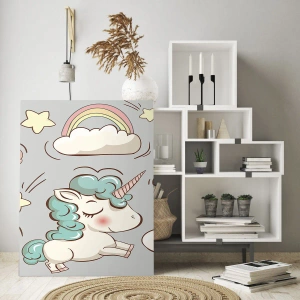 Quadro em vidro - Unicórnios fofos nas nuvens com um arco-íris e balões - 70x50cm - Certamente existem... - Decoração de parede moderna para a sala de estar e quarto ARTTOR