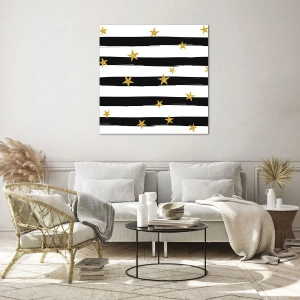 Quadro em vidro - Listras pretas e brancas com estrelas douradas - 70x50cm - Todos nós nascemos sob uma estrela da sorte - Decoração de parede moderna para a sala de estar e quarto ARTTOR