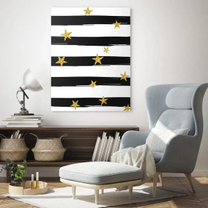 "Todos Nascemos Sob uma Estrela da Sorte" é uma elegante impressão em vidro de 70x50 cm com gráficos modernos com listras pretas e brancas e estrelas douradas. Esta composição impressiona pela sua simplicidade e clareza, combinando o contraste de padrões geométricos com o brilho luxuoso dos detalhes dourados.