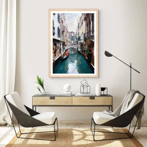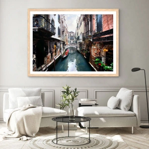 Pôster com moldura de carvalho claro - Paisagem veneziana com gôndola e ponte - 70x100 cm