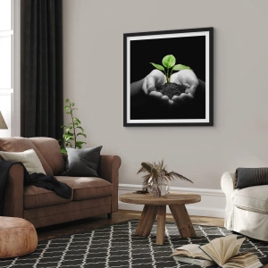 Pôster com moldura preta - Uma planta nas mãos simbolizando a vida e a natureza - 50x70cm - Eu amo a natureza, eu a protejo - Decoração de parede moderna para a sala de estar e quarto ARTTOR