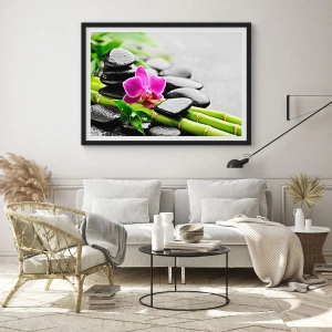 Pôster com moldura preta - Orquídea roxa em pedras molhadas e folhas verdes - 50x70cm - Calmo equilíbrio - Decoração de parede moderna para a sala de estar e quarto ARTTOR
