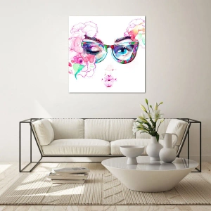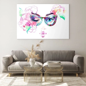 Quadro em vidro - Olhos femininos com flores e óculos coloridos em estilo aquarela - 70x50cm - Uma promessa tentadora - Decoração de parede moderna para a sala de estar e quarto ARTTOR