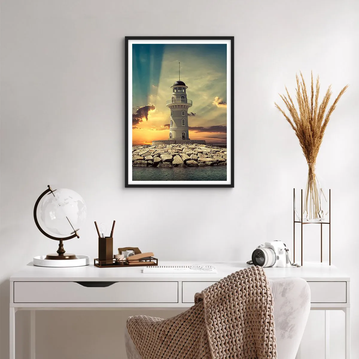 Se você procura um pôster que adicione charme e um toque de estilo náutico ao seu interior, "Farol ao Pôr do Sol" é a escolha perfeita. Combina tanto com interiores modernos quanto clássicos, enfatizando seu caráter único.