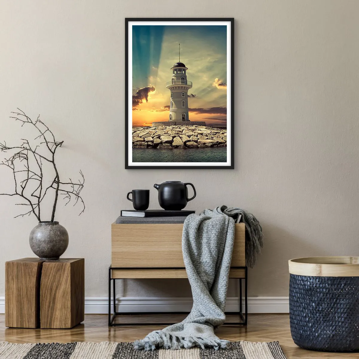 - Este pôster apresenta um farol em uma costa rochosa ao pôr do sol. Perfeito para interiores náuticos ou clássicos, ele traz uma sensação de calma e elegância.