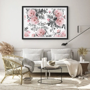 Pôster com moldura preta - Rosas cor de rosa sobre um fundo de folhas pretas e brancas - 50x70cm - Perder-se nas rosas - Decoração de parede moderna para a sala de estar e quarto ARTTOR