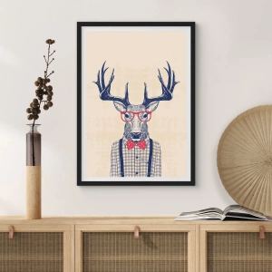 - Este pôster retrata um cervo estiloso usando óculos e gravata borboleta sobre um fundo bege. Este design original e bem-humorado é perfeito para interiores modernos. Vem com uma elegante moldura preta para completar o visual.