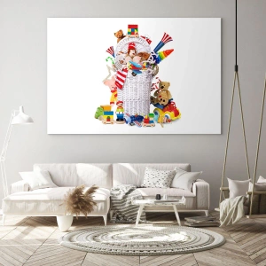 Quadro em vidro - Uma cesta cheia de brinquedos coloridos em um fundo branco - 70x50cm - Tesouros das crianças - Decoração de parede moderna para a sala de estar e quarto ARTTOR