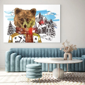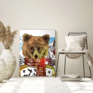 A ilustração é caracterizada por um estilo esboçado que destaca os detalhes sutis do urso e do ambiente ao redor. Graças às suas cores ricas e composição única, a pintura se encaixa perfeitamente em interiores decorados em estilos escandinavo, moderno ou rústico. Também se adapta perfeitamente à atmosfera de inverno e férias.