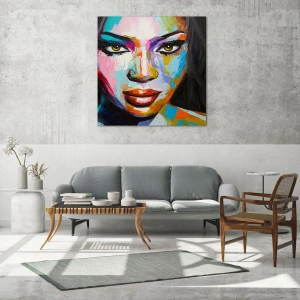 As cores da pintura são uma combinação de tons profundos de azul, rosa, vermelho, laranja e amarelo, que conferem ao conjunto um caráter moderno e dinâmico. O estilo artístico utiliza elementos de abstração, o que confere um caráter único ao retrato e o torna uma escolha ideal para os amantes da arte contemporânea. O rosto da mulher é apresentado de forma única, conferindo à pintura expressividade e personalidade.