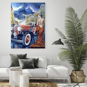 O acabamento em vidro confere à impressão uma profundidade de cor e um brilho excepcional, enfatizando a elegância de toda a composição. A tecnologia de impressão utilizada garante alta qualidade e durabilidade, garantindo que a impressão mantenha seu valor estético por muitos anos. O vidro como material adiciona um toque moderno à obra, contrastando perfeitamente com o motivo retrô da pintura.