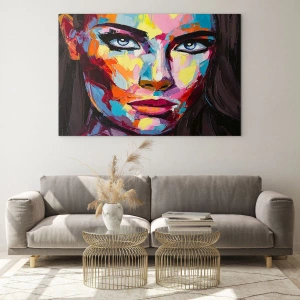 O rosto da mulher, ponto focal da pintura, é composto por várias cores e formas que se entrelaçam, criando um efeito de profundidade e expressão. O estilo abstrato confere à obra um caráter moderno, tornando-a uma excelente opção para interiores contemporâneos. Cores intensas, como amarelo, vermelho, azul e roxo, trazem energia e uma atmosfera única ao ambiente. Esta pintura é perfeita como decoração para uma sala de estar, quarto ou escritório, adicionando um toque artístico ao interior. Graças ao acabamento de alta qualidade da superfície de vidro, as cores são incrivelmente vibrantes e a pintura é durável e resistente aos elementos. Seu estilo moderno a torna adequada tanto para arranjos minimalistas quanto para arranjos mais ecléticos. O produto foi criado pela renomada empresa ARTTOR, que garante a mais alta qualidade de acabamento. O formato horizontal e as dimensões de 70x50 cm permitem que ela preencha perfeitamente o espaço na parede, atraindo o olhar e se tornando um ponto focal da decoração.