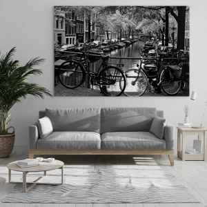 Quadro em vidro - Vista em preto e branco de um canal com bicicletas e barcos - 70x50cm - Vista muito holandesa - Decoração de parede moderna para a sala de estar e quarto ARTTOR