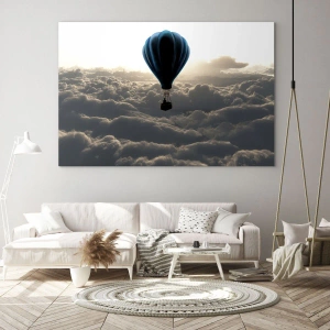 O motivo do balão acima das nuvens simboliza sonhos, liberdade e uma pausa na vida cotidiana. As cores delicadas e a composição minimalista tornam esta pintura adequada tanto para interiores claros quanto escuros, adicionando uma atmosfera única a eles.