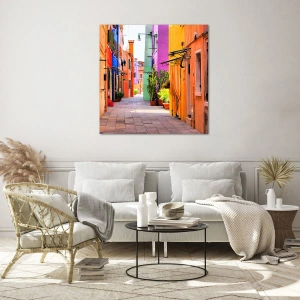 Quadro em vidro - Uma rua colorida com casas de cortiços em tons quentes - 70x50cm - Beco arco-íris - Decoração de parede moderna para a sala de estar e quarto ARTTOR