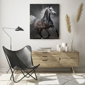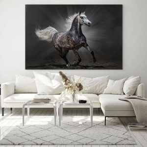Quadro em vidro - Um cavalo galopando contra um fundo escuro com efeito de iluminação. - 70x50cm - O cinza é lindo - Decoração de parede moderna para a sala de estar e quarto ARTTOR
